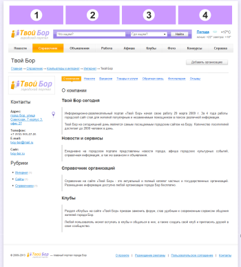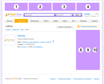 Размещение рекламыГородской портал «Твой Бор» предлагает следующие виды размещения рекламы: 1. Баннерная реклама. Прайс-лист по запросу. 2. Размещение новостей, акций, спецпредложений компании в разделе «Новости компаний города Бор» - 900 руб/неделя. 3. Размещение логотипа в «Справочнике организаций» - 1200 руб за 6 месяцев. 4. Размещение афиши по запросу. afisha@tvoy-bor.ru Заказать размещение рекламы:
