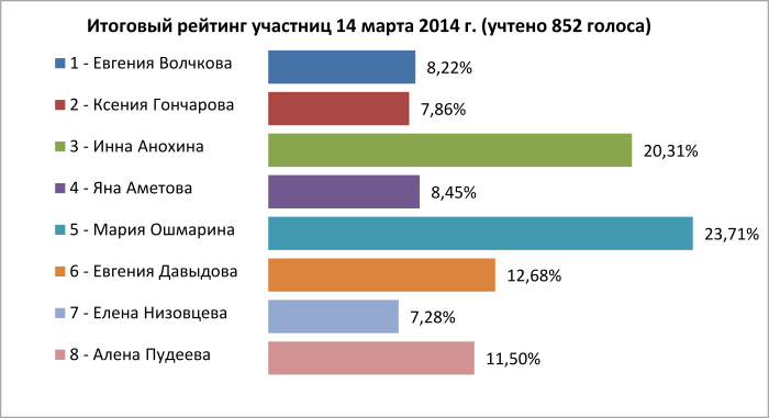 Уважаемые посетители портала «Твой Бор» предлагаем вам принять участие в ежегодном онлайн голосовании за звание «Мисс зрительских симпатий» конкурса красоты «Мисс Бор - 2014» 14 марта 2014 года в городе Бор в МБУК "Центр культуры "Октябрь" состоится традиционный конкурс красоты, молодости и грации "Мисс Бор – 2014" . Онлайн голосование за "Мисс зрительских симпатий" проходит с 14 февраля по 13 марта 2014 года. Для участия в голосовании отправьте СМС на номер 2420 с текстом: Мисс # , где # - номер участницы. (С одного номера телефона можно проголосовать только один раз. Средняя стоимость смс равна 1,7 руб. и зависит от сотового оператора. Стоимость смс) Победительница голосования получит почётное звание "Мисс зрительских симпатий", а также подарки от салона красоты «Гелиос» и городского портала "Твой Бор" Результаты онлайн голосования будут объявлены 14 марта на финале конкурса в МБУК "Центр культуры "Октябрь"! Промежуточные результаты голосования будут публиковаться на сайте 1 раз в неделю. Спешите сделать свой выбор! Голосование завершено! Титул "Мисс зрительских симпатий" завоевала Мария Ошмарина