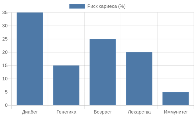 Круговая диаграмма, показывающая распределение продуктов питания по степени влияния на развитие кариеса. Гигиена остается доступным инструментом профилактики, особенно в условиях российского здравоохранения, где профилактические программы охватывают школьников. Системные факторы риска кариеса Системные факторы включают внутренние состояния организма, влияющие на устойчивость зубов к разрушению. Эти аспекты выходят за рамки локальных процессов в полости рта и связаны с общим здоровьем. В российском здравоохранении, где хронические заболевания затрагивают значительную долю населения, такие факторы определяют индивидуальную предрасположенность к кариесу. Например, эндокринные нарушения, такие как сахарный диабет, изменяют состав слюны, снижая ее буферную емкость и способствуя быстрому развитию инфекций. Диабет типа 2, распространенный в России среди взрослых старше 40 лет, повышает риск кариеса в 2–3 раза за счет гипергликемии, которая питает бактерии. Пациенты с этим заболеванием часто испытывают ксеростомию, уменьшающую естественную очистку рта. Аналогично, аутоиммунные состояния, включая синдром Шегрена, приводят к сухости слизистых, где слюна не может нейтрализовать кислоты своевременный. Данные Федерального регистра диабета указывают, что у 60% пациентов с диабетом наблюдается прогрессирующий кариес без адекватного контроля гликемии. Системные заболевания модифицируют микросреду полости рта, усиливая действие локальных кариесогенов. Генетические аспекты играют роль в структуре зубов и слюны. Мутации в генах, кодирующих белки эмали, такие как AMELX, приводят к амелогенезу несовершенному — состоянию с тонкой эмалью, уязвимой к эрозии. В России генетическая предрасположенность выявляется у 5–10% населения в промышленных регионах с высоким уровнем мутагенов. Кроме того, наследственные черты влияют на вязкость слюны: низкий уровень муцинов снижает защитный барьер, увеличивая адгезию бактерий. Возрастные изменения представляют собой системный фактор, эволюционирующий с годами. У детей кариес часто поражает молочные зубы из-за незрелости эмали, богатой органикой. В пожилом возрасте рецессия десен обнажает дентин, более проницаемый для кислот, что приводит к корневому кариесу. Статистика Минздрава России фиксирует рост заболеваемости среди пенсионеров на 15% за последние годы, связанный с полифармацией и атрофией слюнных желез.