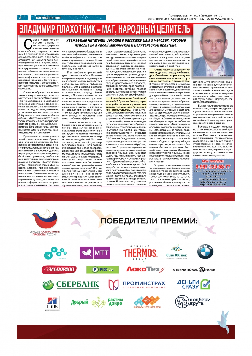 Магия любви и семейных отношений, магия Вашего финансового благополучия и успеха, магия для здоровья, женская магия, ювенальная магия. Выявление и устранение любых негативных энергоинформационных воздействий - порчи, сглаза, проклятий, приворотов, зомбирования, подселения, одержимости. Сильная, многоступенчатая магическая защита от негативных воздействий, недоброжелателей, негативных событий. Обережный заговор для воинов. Коррекция кармы, изменение судьбы. Снятие негативных программ, связанных с датой и временем рождения: негативного влияния нулей в конце года рождения, числа, месяца, трёх и более шестёрок - явных или скрытых, например 18, 24, натальной тьмы - для тех, кто рождён в тёмное время суток, других негативных программ. Привлечение успеха, финансового благополучия, любви, восстановление и гармонизация семейных, любовных, дружеских, деловых, родственных отношений, просмотр совместимости партнёров для бизнеса и брака. Обряды на женскую и девичью привлекательность, замужество. Владимир Плахотник +7 (909) 231-27-27