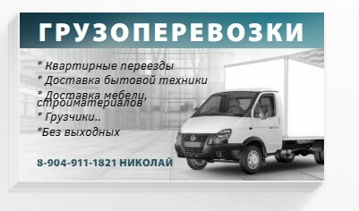 ГРУЗОПЕРЕВОЗКИ, ГАЗЕЛЬ, ГРУЗЧИКИ... ДЛИНА 4М, ШИРИНА 1.9М, ВЫСОТА 2.2М... ГРУЗОПОДЪЕМНОСТЬ ДО 2 ТОНН... БЕЗ ВЫХОДНЫХ.. ТЕЛ. 8-904-911-18-21 НИКОЛАЙ Похожие объявления договорная