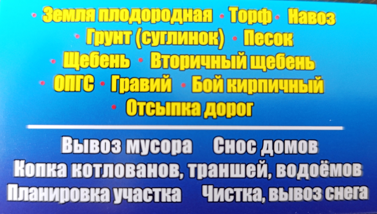 Юлия УСЛУГИ СПЕЦТЕХНИКИ Продажа и доставка: ✅ Земля плодородная ✅ Торф ✅ Навоз ✅ Грунт (суглинок) ✅ Песок ✅ Щебень ✅ Вторичный щебень ✅ ОПГС ✅ Гравий ✅ Бой кирпичный ✅ Отсыпка дорог ???? Вывоз мусора ???? Снос домов ???? Копка котлованов, траншей, водоемов ???? Планировка участка ???? Чистка Похожие объявления договорная