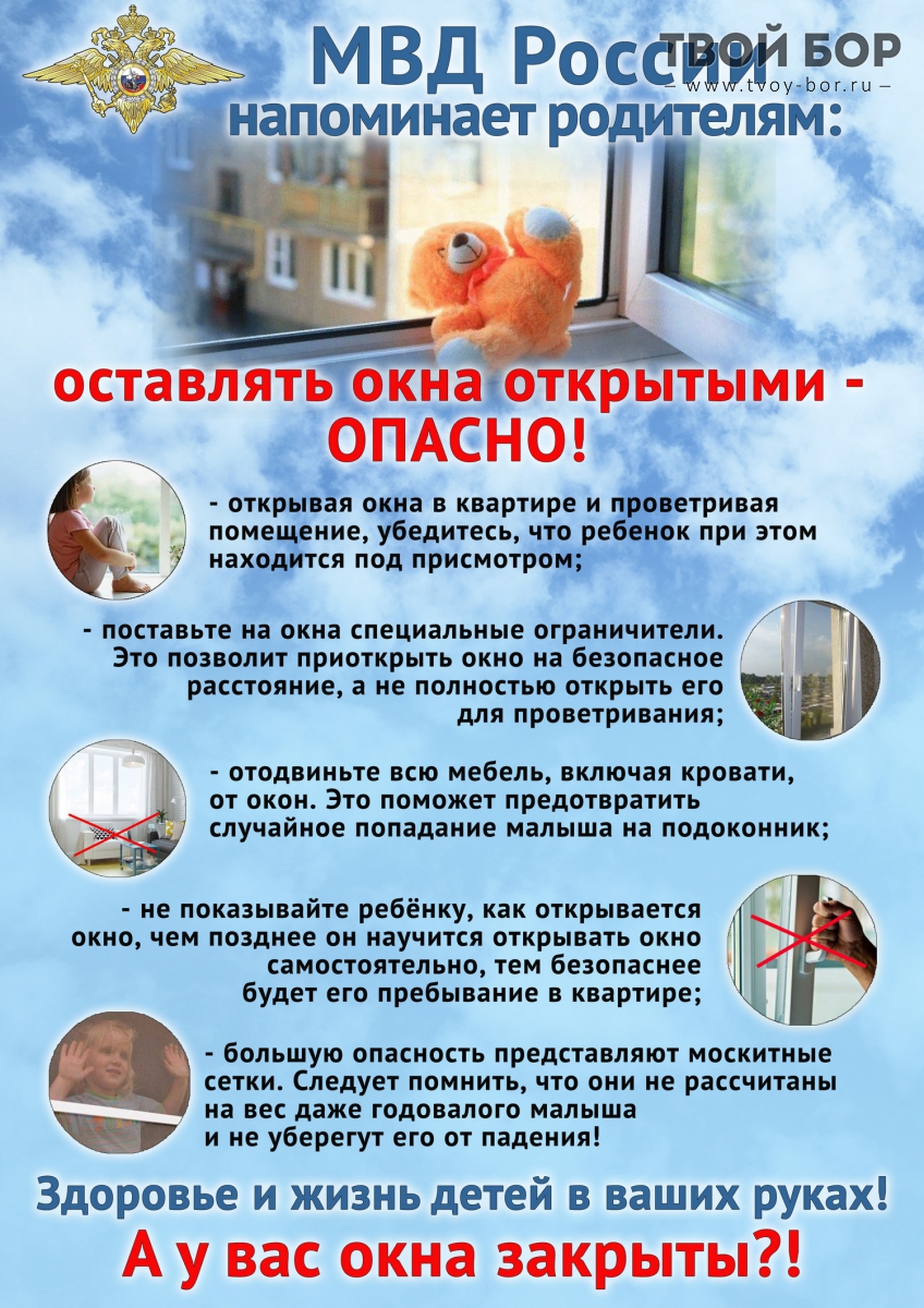 Ежегодно в летний период по всей стране регистрируются случаи выпадения малолетних детей из окон, которые нередко заканчиваются их гибелью. С целью профилактики подобных трагедий МВД России разработаны иллюстрированные памятки с информацией о том, как уберечь своего ребенка от смертельной опасности. Именно с этими листовками участковые уполномоченные полиции совместно с начальником отдела по делам несовершеннолетних Отдела МВД России по г.Бор майором полиции Натальей Добряковой вышли в места отдыха и на главные улицы. «В силу своей любознательности малыши уязвимы перед открытым окном. Оставляя детей под присмотром родственников преклонного возраста, либо старших несовершеннолетних детей, родители должны помнить о том, что пожилым людям сложно контролировать поведение юркого ребенка, а подростки, не имея жизненного опыта, не способны оценить всю степень опасности, которую представляет для их младшего брата или сестры открытое окно», - рассказывает майор полиции Наталья Добрякова. Инспекторами по делам несовершеннолетних совместно с представителями учреждений субъектов профилактики регулярно проводится разъяснительная работа с гражданами по профилактике травматических случаев с несовершеннолетними. Информацию о том, как предотвратить трагедию, полицейские доводят до населения в рамках встреч различных форматов, в которых также принимают участие участковые уполномоченные полиции и члены Общественного совета при Отделе МВД России по г. Бор. Полицейские напоминают, что чаще всего причиной несчастных случаев становятся невнимательность родителей. Родители должны помнить, что москитные сетки создают лишь видимость барьера, но в действительности не могут выдержать вес ребенка, облокотившегося на них. Чтобы проветривать помещение было безопасно, следует оборудовать окна специальными ограничителями, которые позволят приоткрыть створку на небольшое расстояние. Около окон не должно находиться никакой мебели, чтобы ребенок не смог попасть на подоконник. А чтобы ребенок не смог самостоятельно открыть окно, необходимо оборудовать его блокирующим устройством. Только максимальное внимание родителей к своим детям поможет предотвратить трагедию.