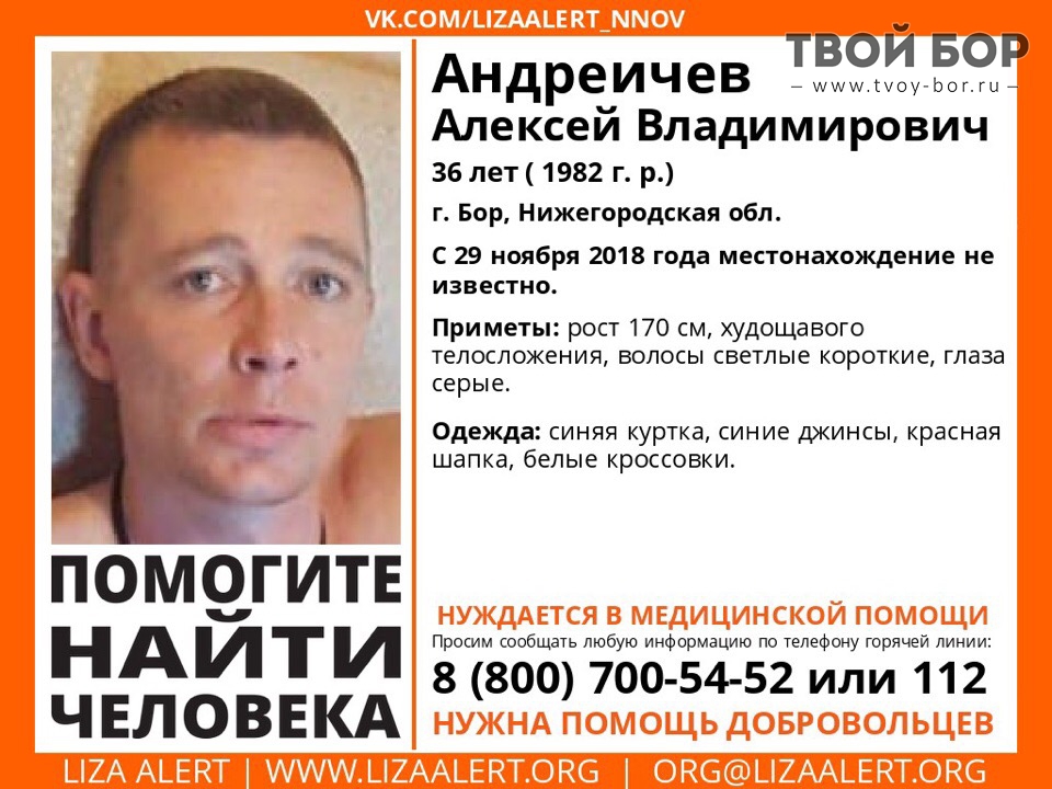 36-летний Алексей Андреичев пропал на Бору![]() Отмечается, что мужчина нуждается в медицинской помощи.