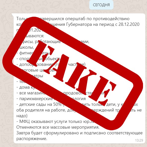 В Нижегородской области опровергли введение карантинаИнформация, которая сегодня появилась в некоторых чатах о якобы закрытии с 28 декабря 2020 года по 17 января 2021 года офисов, работающих с физлицами, школ, спортивных объектов, торговых центров, кинотеатров, частично — детских садов, а также других учреждений, НЕ СООТВЕТСТВУЕТ ДЕЙСТВИТЕЛЬНОСТИ И ЯВЛЯЕТСЯ ЛОЖНОЙ.