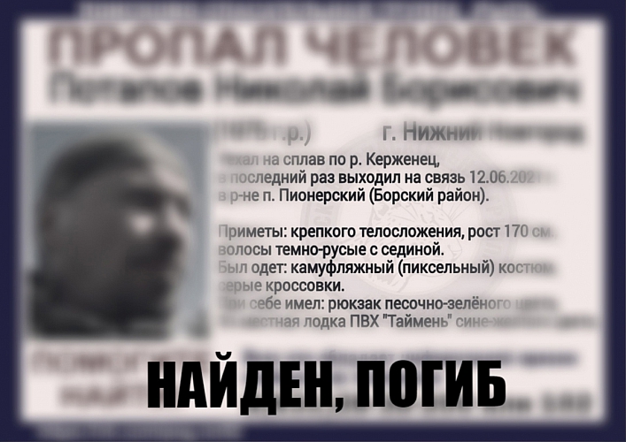 Тело пропавшего на Бору мужчины извлечено из рекиПотапов Николай 1975 года рождения уехал на сплав по реке, последний раз выходил на связь 12 июня в районе п. Пионерский, однако после пропал.