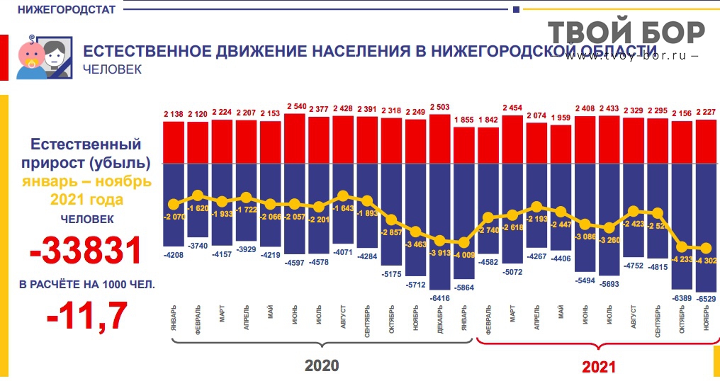 Смертность в Нижегородской области в три раза превысила рождаемость![]() К концу 2021 года в Нижегородской области ежемесячно официально рождалось чуть более 2 тысяч человек, ежемесячно погибало в начале осени 4,8 тысяч человек, к концу рекордные 6,5 тысяч. Естественная убыль населения пока неестественно велика. В вашем окружении за прошедший год людей больше рождалось или погибало? Или осталось без изменений? Инфографика Нижегородстат. Источник: Твой Бор