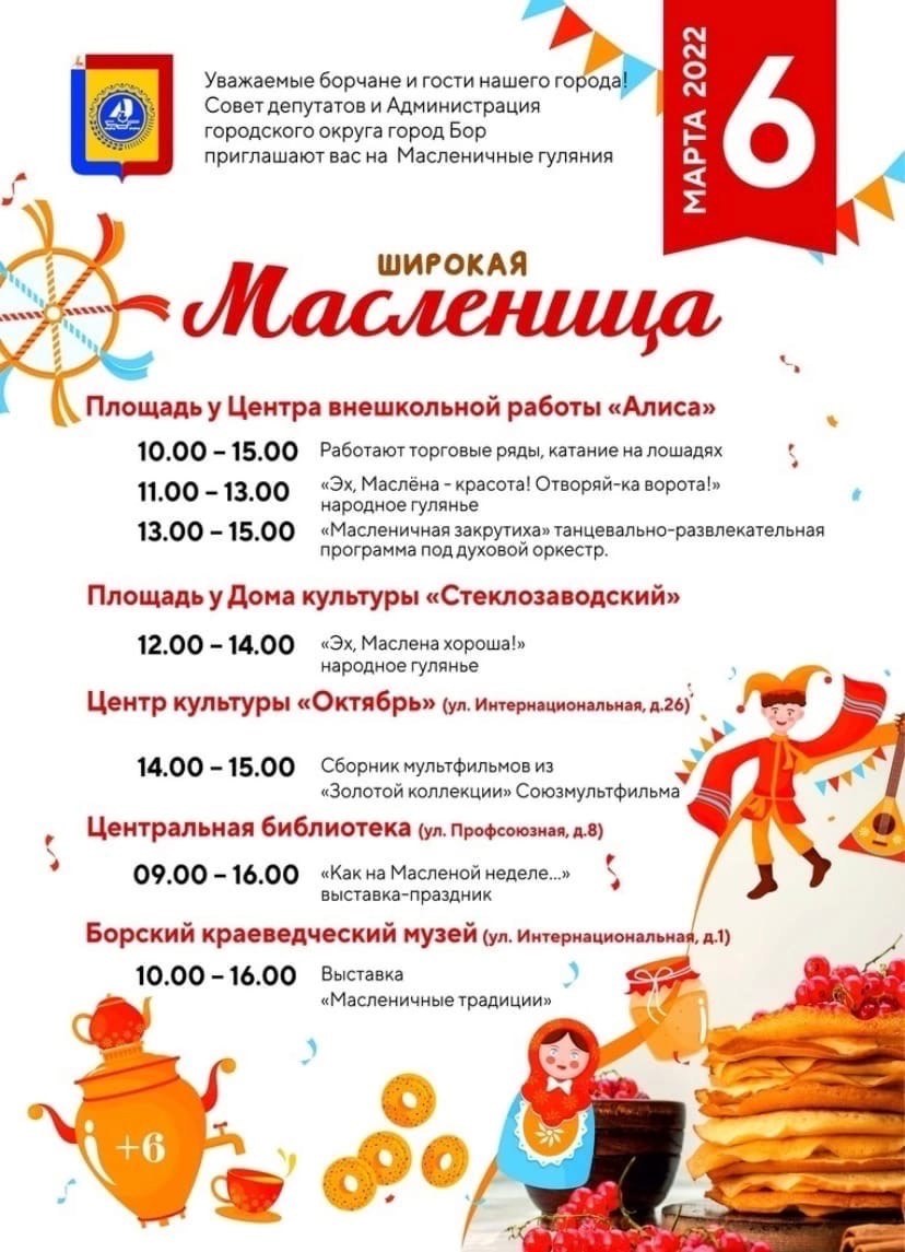 "По Масленице на Бору решения были приняты заранее, с учетом обстановки подтверждены решением оперативного штаба. Мероприятия будут проводится учреждениями культуры с разрешенном и согласованном формате, задействовано несколько площадок, основные мероприятия - для детей, и я уверен, что всё пройдёт комфортно и безопасно. В гуляниях примут участие в том числе и наши гости из Луганска и Донецка". Праздник пройдёт на городских площадках около "Алисы", ДК "Стеклозаводский", в Неклюдово, Октябрьском, Б. Пикино и на сельских территориях. Начало в 11 ч.