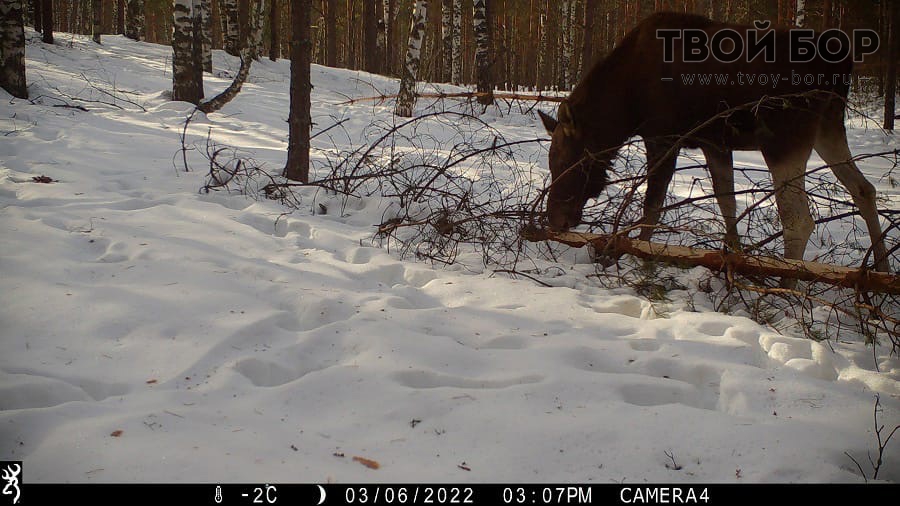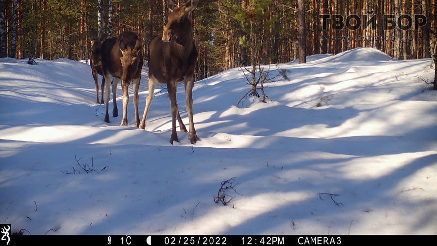 Такой температурный режим после февральского потепления способствовал установлению крепкого наста, выдерживающего по утрам не только спешащих на работу сотрудников заповедника, но и крупных животных. По сообщению научного сотрудника А.Е. Волкова, в этом году в начале марта по утрам по насту, не проваливаясь в глубокий снег, спокойно передвигаются лоси. После январских снегопадов многие деревья наклонились к земле, вершины некоторых сосен отломились под тяжестью снежных «шапок». Фотоловушки показывают нам, как звери используют эту ситуацию. Зайцы-беляки объедают верхушки наклонённых осин, лоси лакомятся молодой корой с вершин сосен. Одна из фотоловушек в урочище Подшилиха показала, что сосна наклонилась к земле 11 января, и уже 15 января лоси начали объедать кору с молодых веток. В начале февраля эта сосна упала и лоси в феврале – марте периодически объедали кору с верхней части ствола упавшего дерева. Фото: А.Е. ВОЛКОВ, О.Ю.ГОРЕЛОВСКАЯ Источник: Керженский заповедник