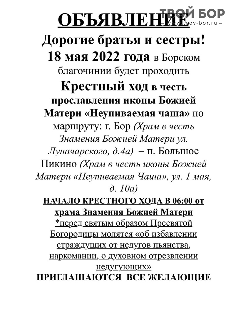 18 мая на Бору состоится крестный ход в честь иконы Божей Матери "Неупиваемая чаша"Начало в 6.00 ч. от Знаменского храма (в Сергиевской слободе). Верующие направятся в храм в п. Б. Пикино.