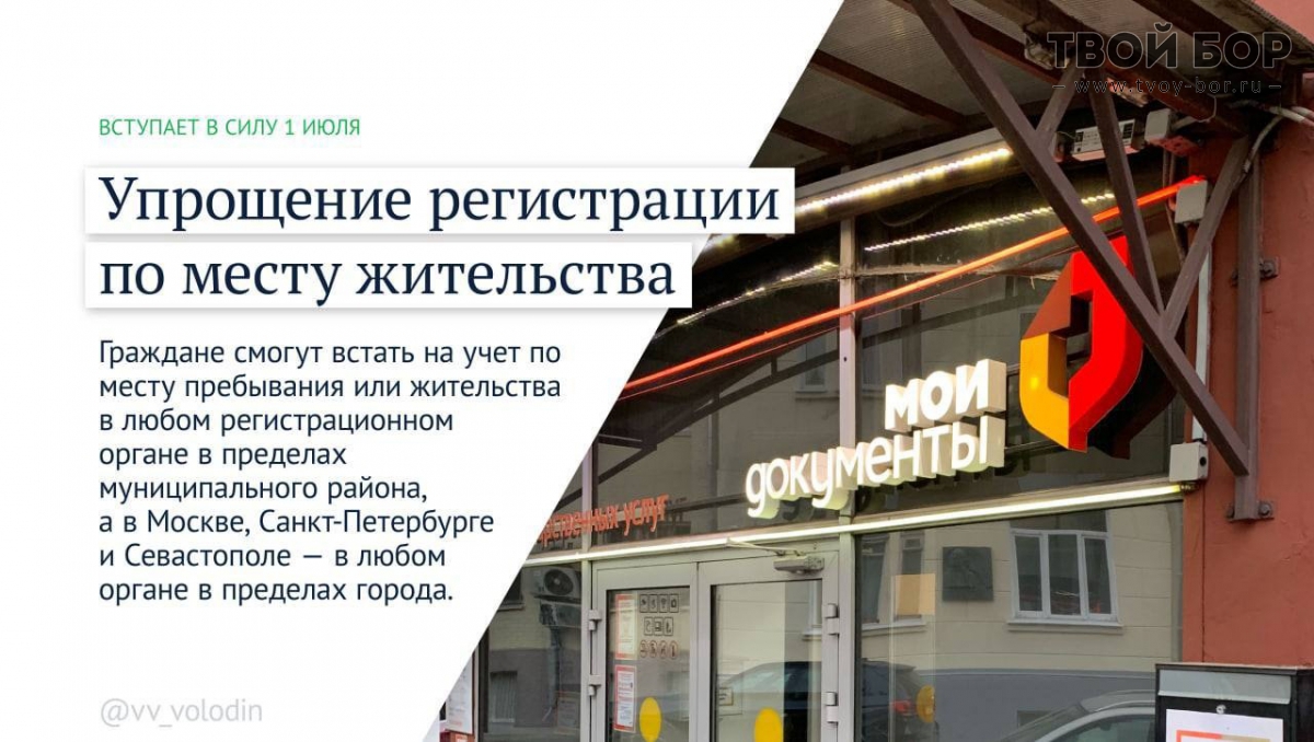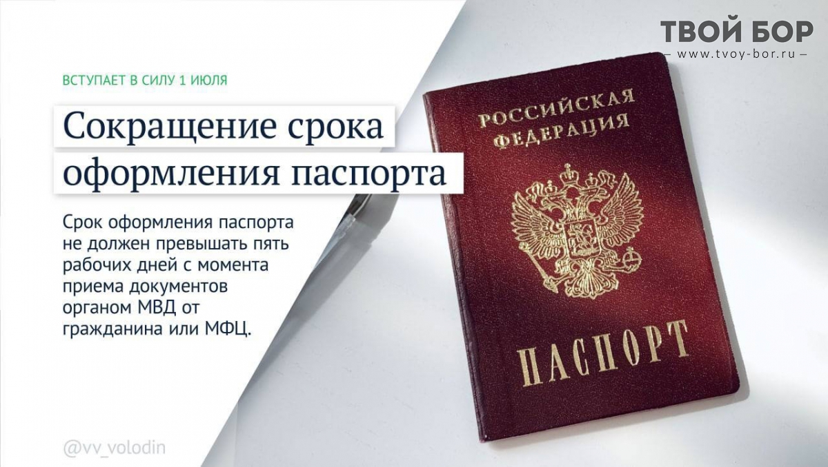 Сократится срок оформления паспорта, упростится регистрация по месту жительства, для получения бесплатной медицинской помощи необязательно будет иметь при себе полис ОМС. О других законах июля — читайте в карточках. Источник: Твой Бор