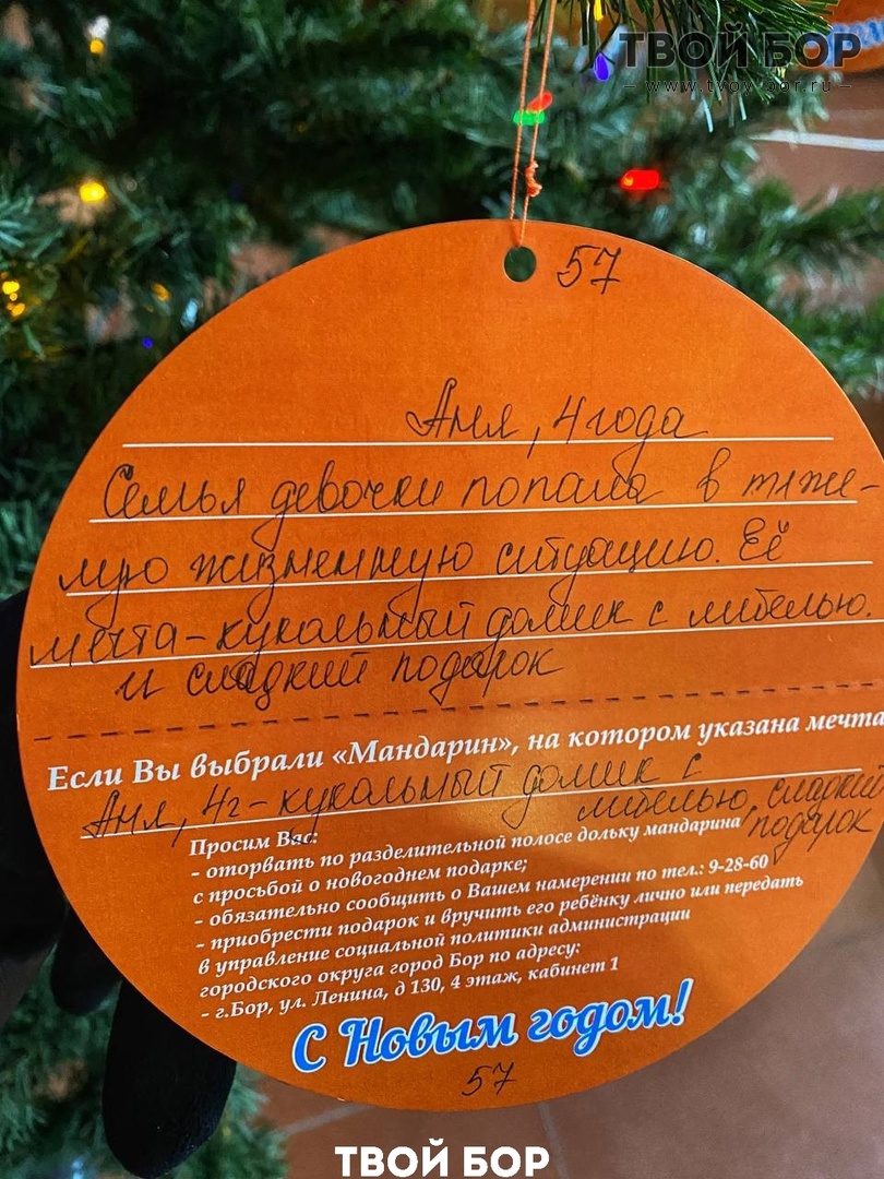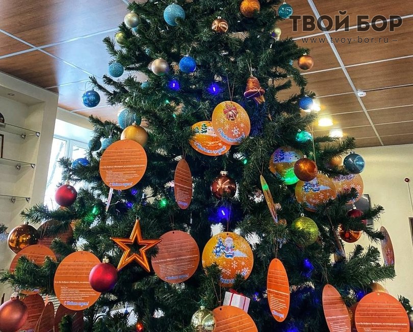 Новогодняя ёлочка, украшенная бумажными мандаринами, установлена в фойе администрации. На каждой мандаринке - новогоднее пожелание ребенка, оказавшегося в трудной жизненной ситуации. Каждый может сорвать мандаринку и воплотить мечту ребенка. Источник: Твой Бор
