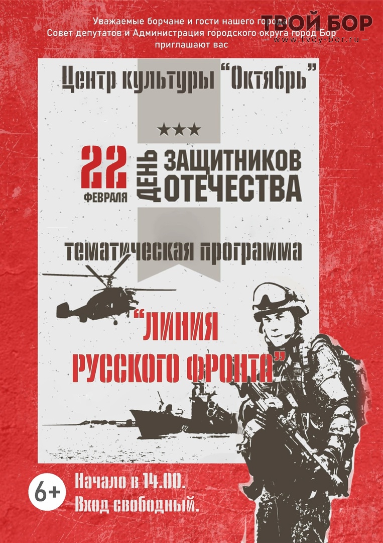 Афиша на День защитника Отечества22 и 23 февраля на Бору пройдут праздничные мероприятия, посвящённые Дню защитника Отечества.