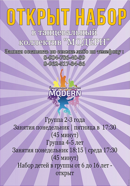 Открыт набор детей в танцевальный коллектив «Модерн» посмотреть информацию о нас и оставить заявку вы можете на нашем сайте http://modern52.tilda.ws ждем вас в новом учебном году ! Комментарии