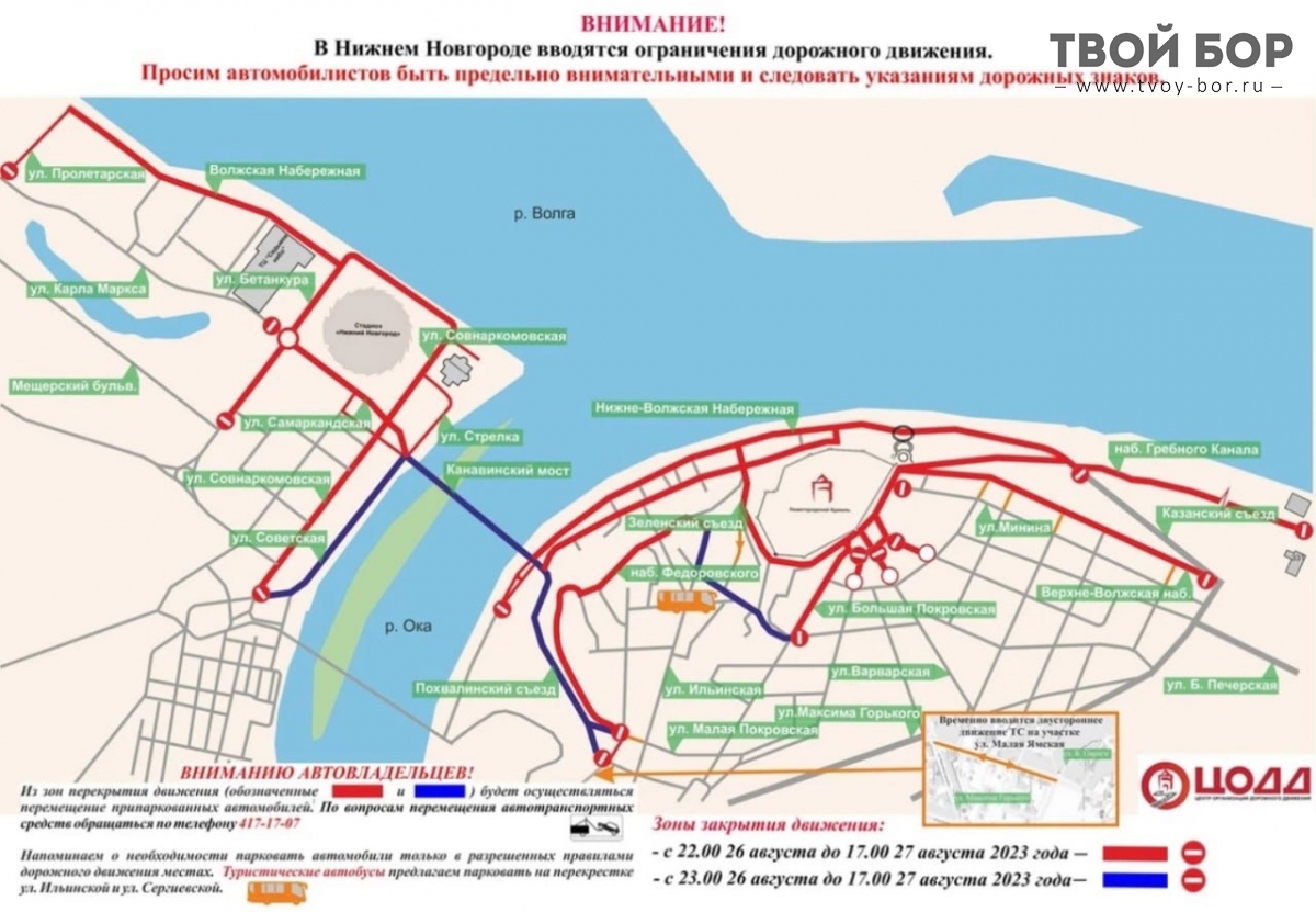 26 и 27 августа транспорту в городе будет трудновато. «Марафон Нижний Новгород» проходит в городе уже в третий раз, на старт выйдут около 8 тысяч бегунов. Дистанция пройдёт по живописным местам: спортсмены увидят реки Оку и Волгу, набережные и мосты, Нижегородский кремль, собор Александра Невского, бывшую фабрику «Маяк» и стадион. Перекрытия дорог введут уже 26 августа в 22:00. Действовать ограничения будут до 27 августа 17:00. Источник: Твой Бор