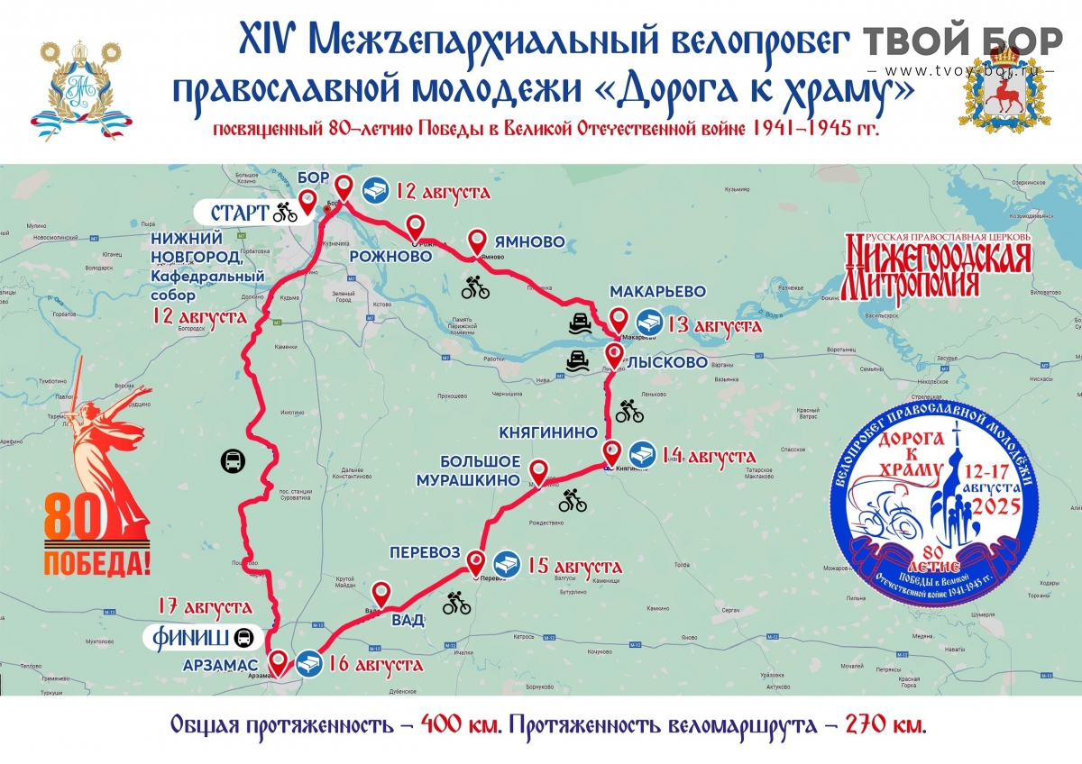 Если увидите на борских дорогах много велосипедистов – не пугайтесь!С 12 по 17 августа 2025 года состоится XIV Межъепархиальный велопробег православной молодежи «Дорога к храму», посвященный 80-летию Победы в Великой Отечественной войне 1941-1945 гг.