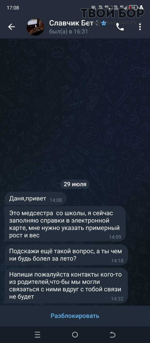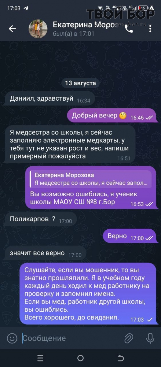 Борчанин поделился подозрительной перепискойЕму пришло сообщение якобы от школьной медсестры с просьбой уточнить личные данные ученика и родителей.