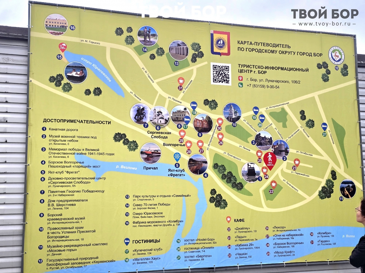 На нем отмечены основные достопримечатености, кафе и гостиницы. Источник: Твой Бор