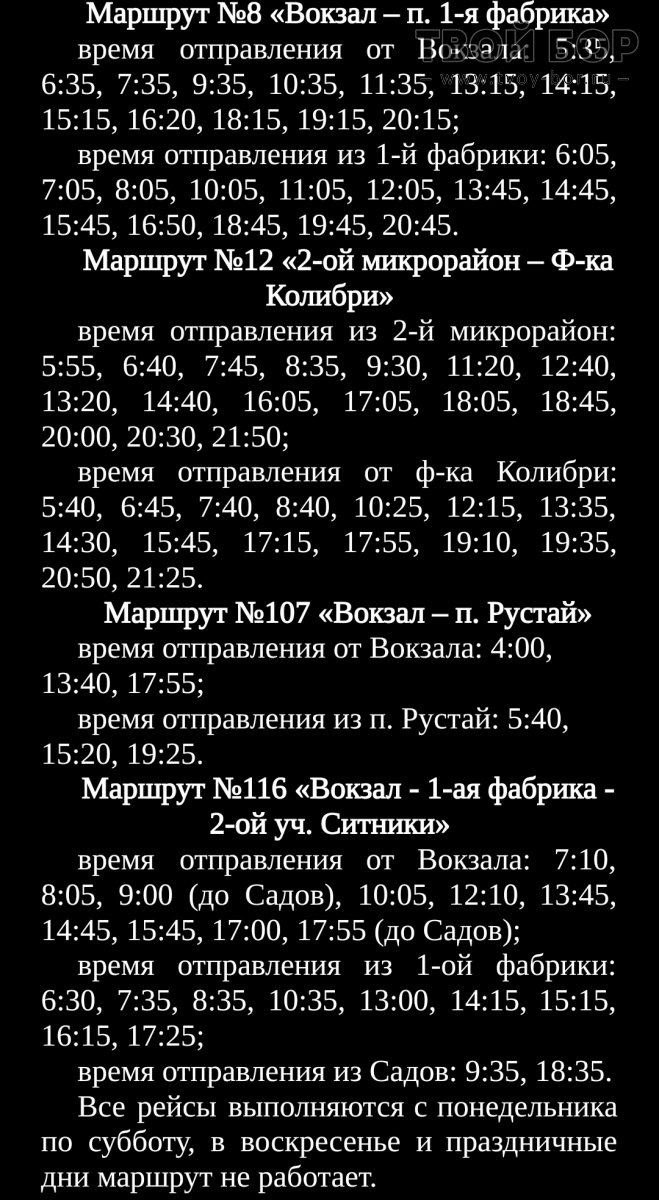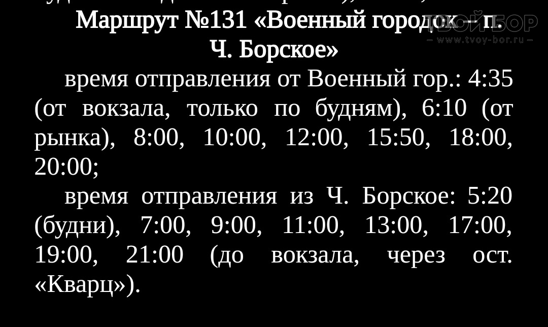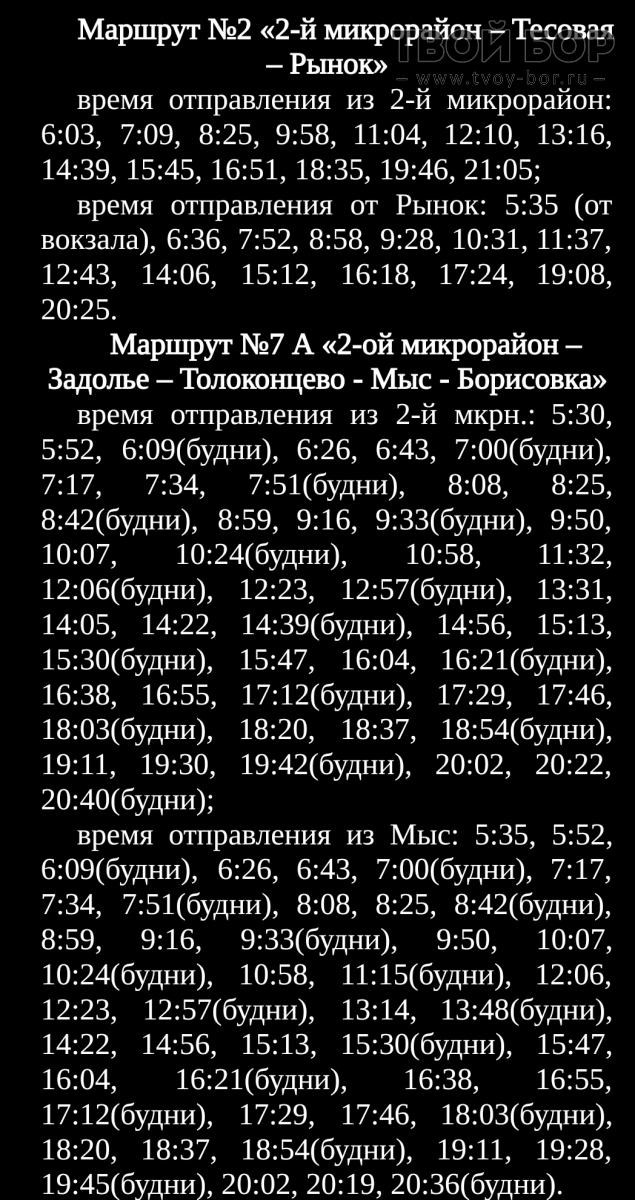 Расписание движения автобусов по маршрутам, обслуживаемым ООО «Столица-Авто»- Маршрут №2 «2-й микрорайон – Тесовая – Рынок» Источник: Твой Бор