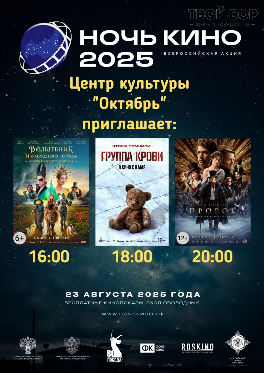 На Бору пройдет «Ночь кино»23 августа пройдет юбилейная, 10‑я Всероссийская акция «Ночь кино» — праздник отечественного кино, который традиционно собирает зрителей в конце лета.
