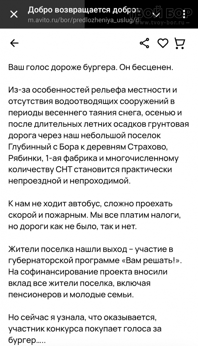 Борчане вышли на новый уровень при попытках набрать большее количество голосов в программе «Вам решать»Теперь и на Авито просят проголосовать за ремонт дороги! Вот это накал страстей.