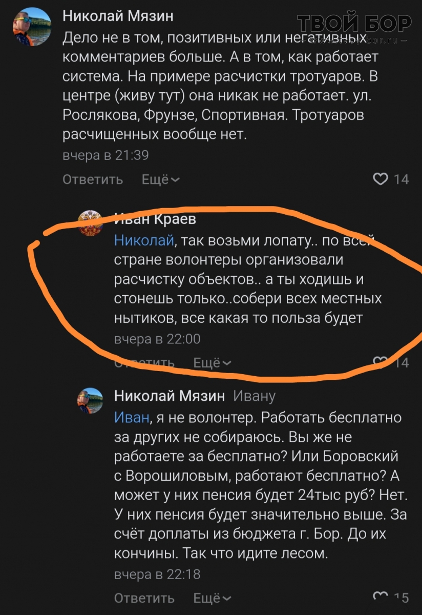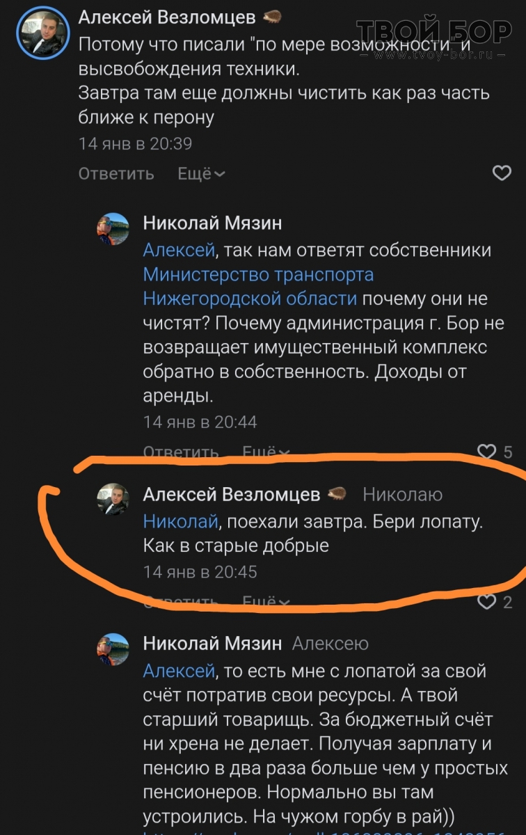 Обещают ещё снегопады. Должностные лица округа призывают брать лопаты и самим расчищать город, не только у своих домов, на парковках. Алексей Везломцев (директор Водоканала) предложил поработать на благо города. Источник: Твой Бор