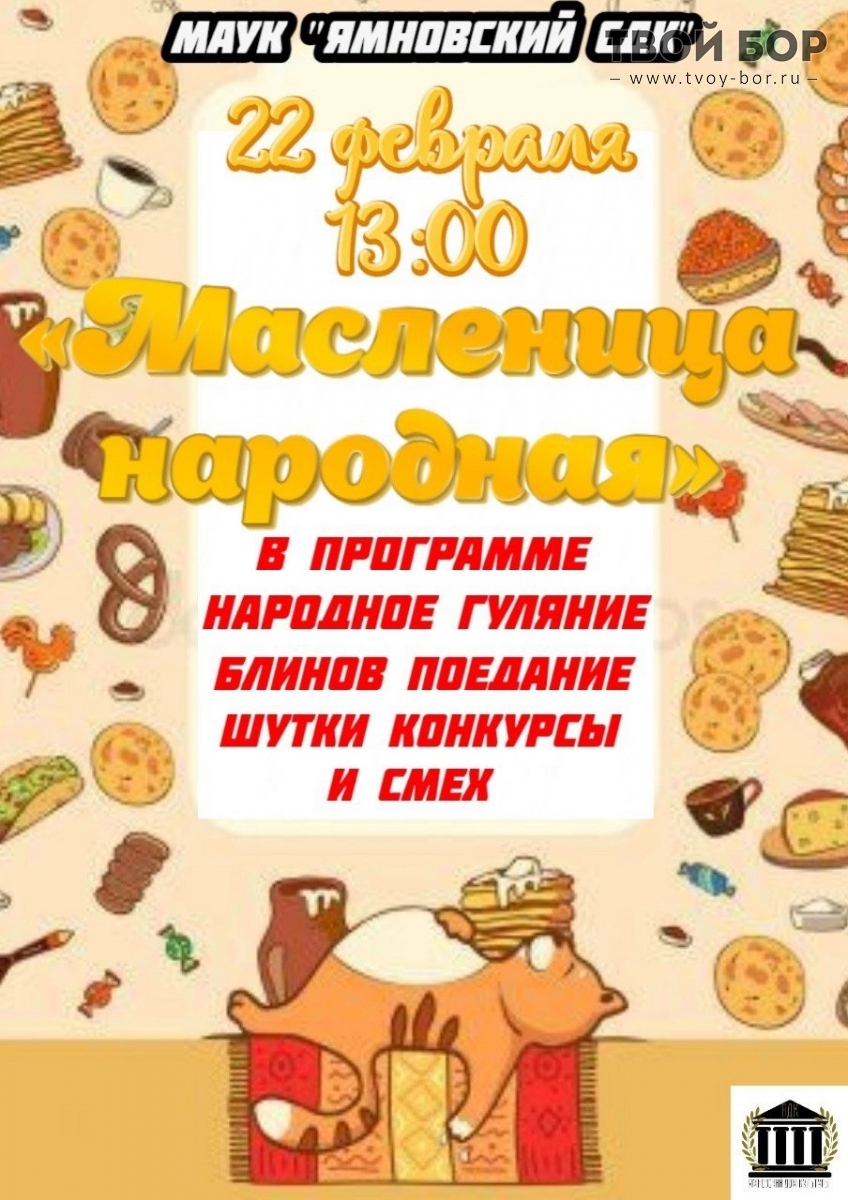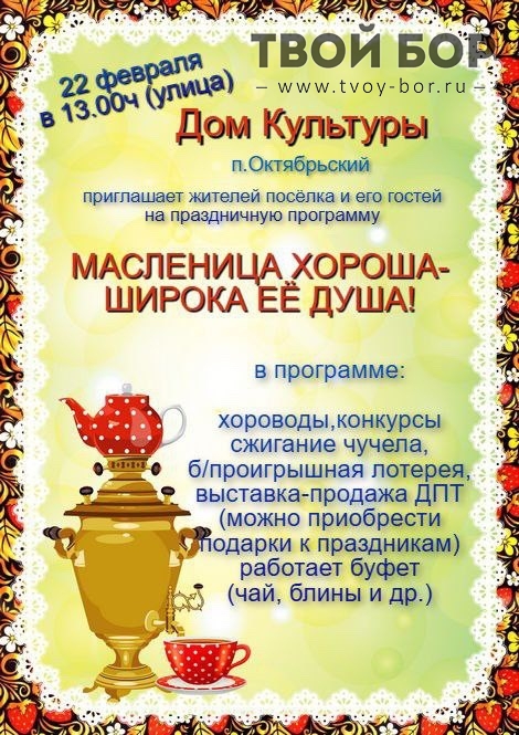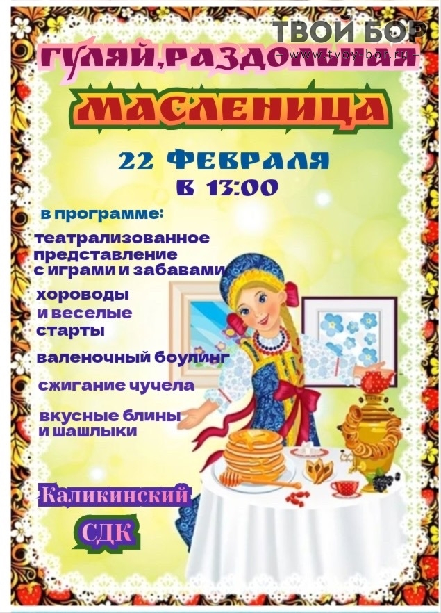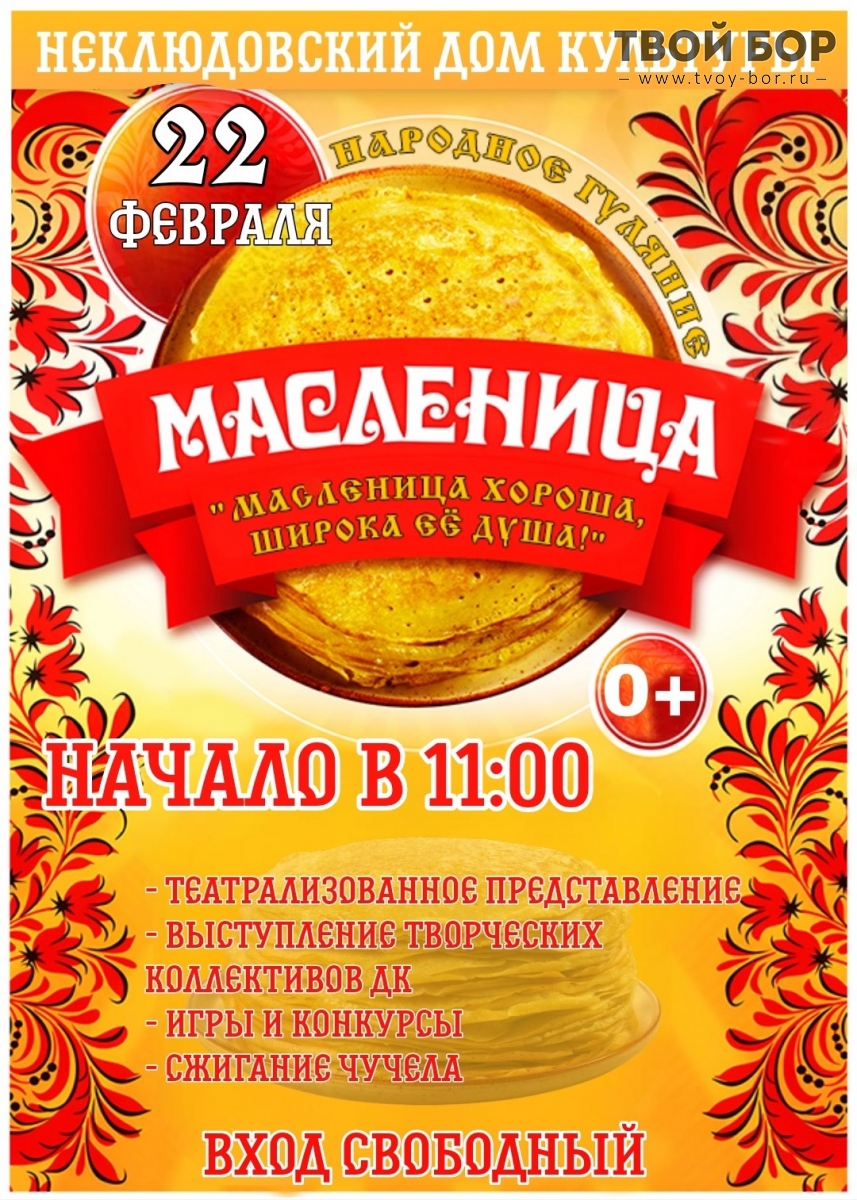 Масленица на Бору!В воскресенье, 22 февраля, борчан приглашают на праздничные гуляния по случаю Масленицы. Будут хороводы, песни, театрализация и, конечно, сжигание чучела!