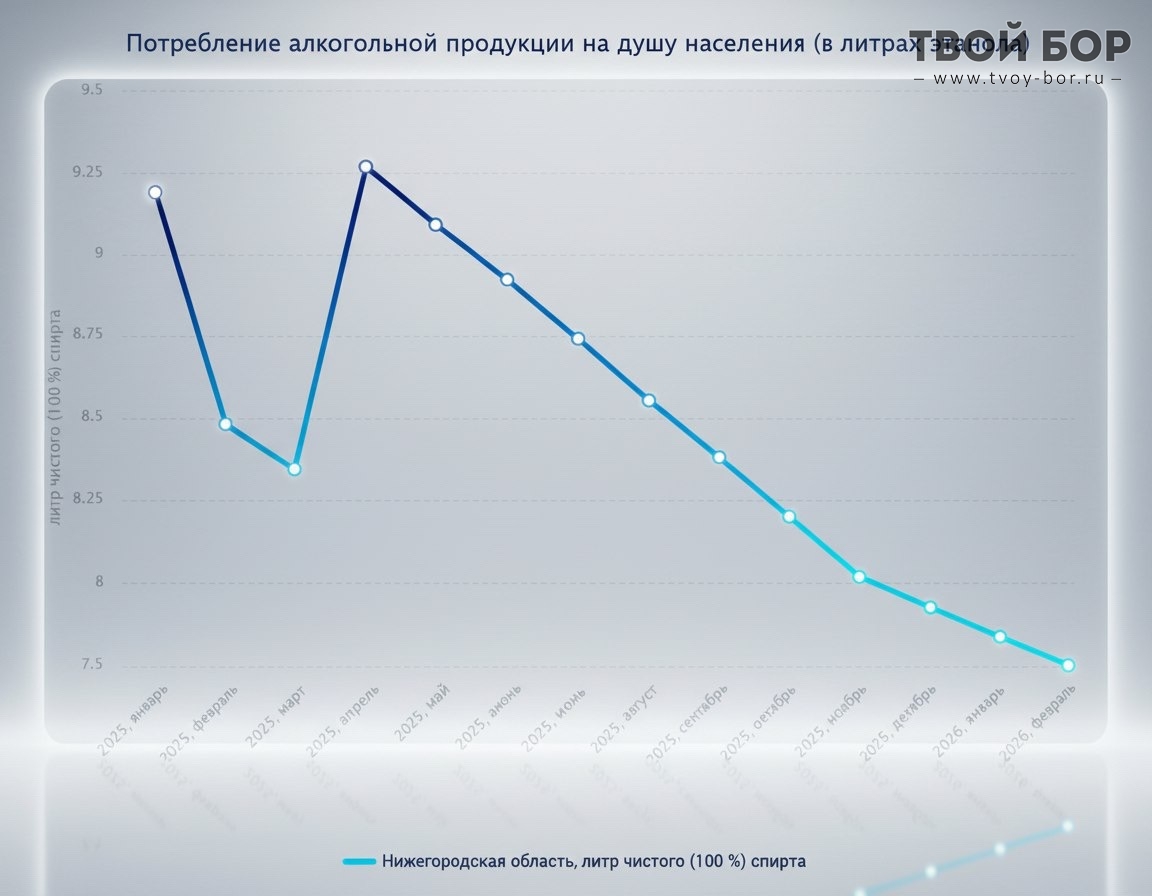 Нижегородская область побила свой же рекорд сокращения потребления алкогольной продукции: в январе 2025 года это было 9,18 литров этанола на душу населения, к февралю 2026-го показатель рухнул до 7,75 литров. Мониторинг Минздрав ведёт в рамках федерального проекта «Здоровье для каждого», а статистика формируется с учётом смертности от причин, обусловленных алкоголем. Источник: Алексей Никонов Комментарии