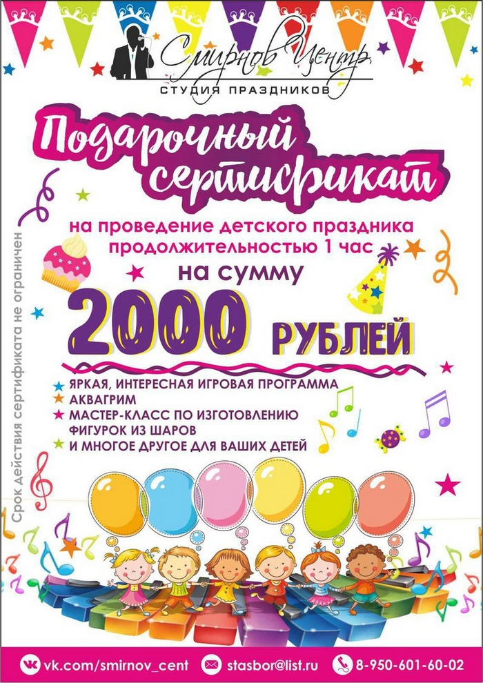 Сертификат на проведение детского праздника от Студии Праздников Смирнов Центр![]() Не знаете какой подарок сделать ребёнку? Подарите сертификат!